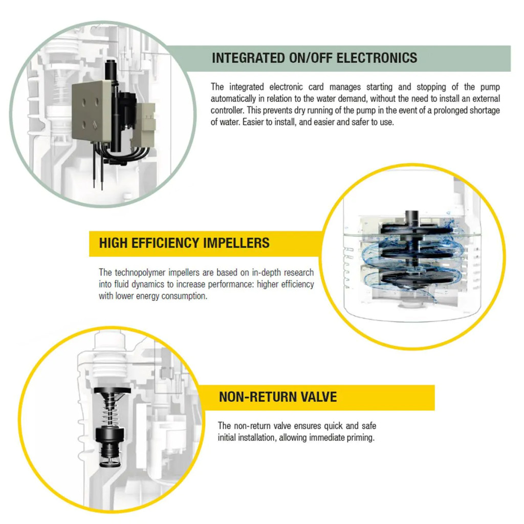 Az integrált elektronikus kártya a vízigényhez igazodva automatikusan vezérli a szivattyú indítását és leállítását, külső vezérlő telepítése nélkül. Ez megakadályozza a szivattyú szárazon futását hosszabb vízhiány esetén. Könnyebb telepíteni, és egyszerűbb és biztonságosabb használni.