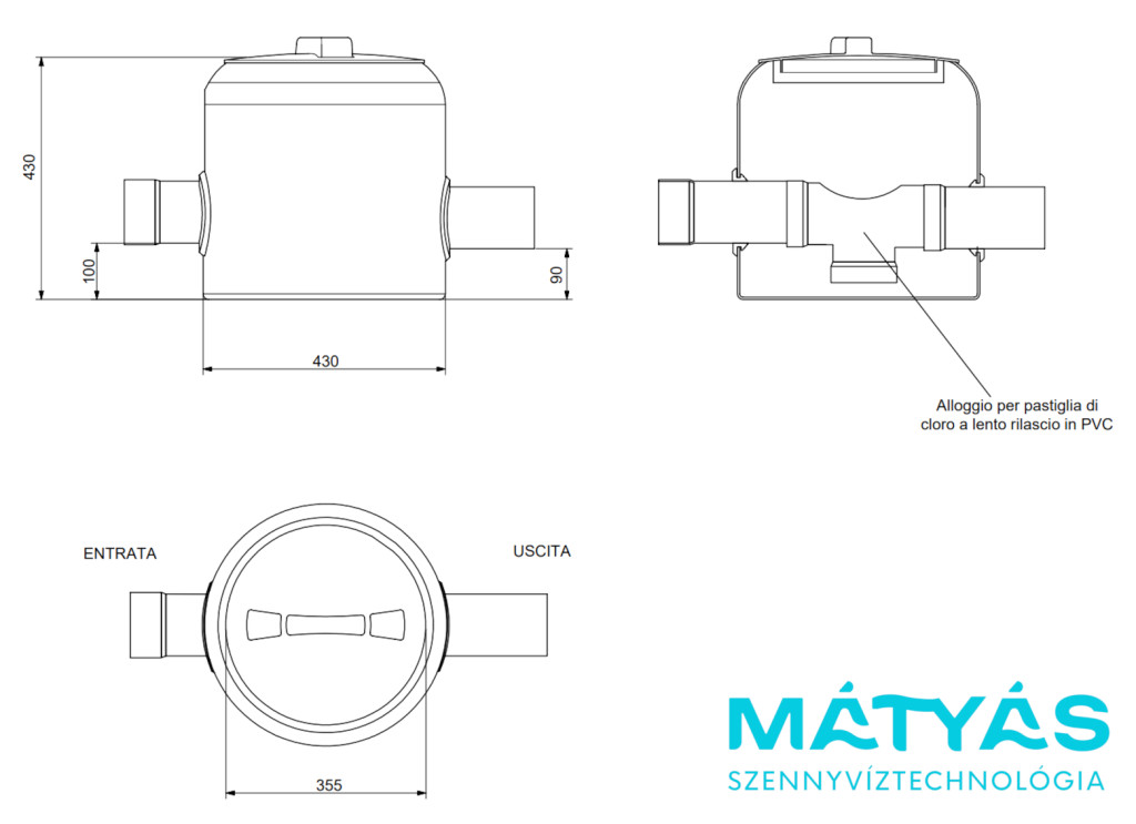 • Ellenőrző nyílás: Ø 355 mm, amely megkönnyíti a karbantartást és a klórtabletták pótlását